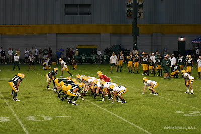 Monday night, under overcast skies and comfortable temperatures, the Packers conducted their first full pads practice of the 2011 Training Camp. Above, players get stretched before the work begins.