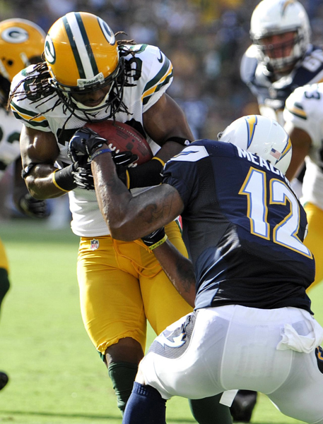 Defensive back Tramon Williams, (#38, left), intercepts a pass intended for San Diego wide receiver Robert Meachem (#12) during the first half.