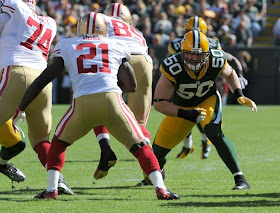 While A.J. Hawk (#50) seems to have a bead on Frank Gore (#21) on this play, the opposite was the case most of the game for the defense.