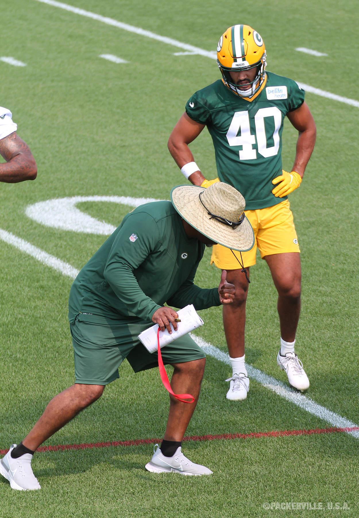 QB Aaron Rodgers (#12), OC Nathaniel Hackett, and Matt Klein (Director of Football Logistics/Team Travel), or as he is known to the fans in camp, “the loud down and distance guy.”